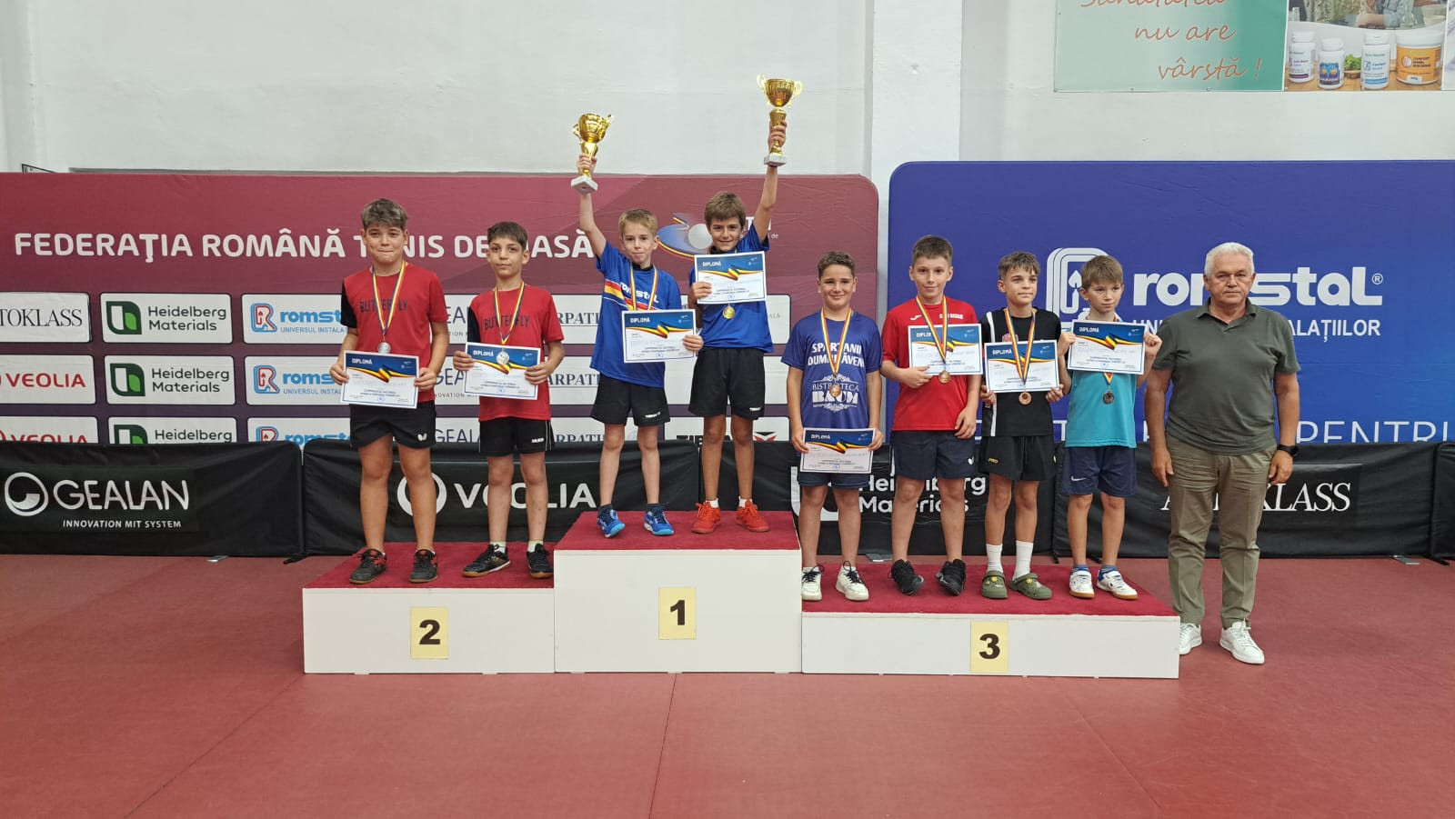 Bistrița a găzduit în perioada 3-7 septembrie Campionatele Naționale de tenis de masă rezervate categoriei de vârstă sub 11 ani. S-a concurat atât la individual și în probe de dublu, cât și pe echipe, iar Aradul s-a ales cu două medalii. Yanis Clenciu (foto, primul de la stânga), legitimat la CSM Arad, în tandem cu Eduard Bina, de la CSM Mediaș, a cucerit argintul național la dublu masculin, în aceeași probă reușind să obțină bronzul Max Wagner (foto, al doilea de la dreapta), de la CS Academia Daniela Dodean Arad, alături de Matei Todoran, tot de la CSM Mediaș. Cei doi au eliminat în optimi favoriții 3 ai competiției. Wagner aduce astfel prima medalie la un campionat național pentru academie, produs al acesteia. În ceea ce privește CSM Arad, la echipe, fetele au jucat în formula Antonia Adolf, Ayana Radu și Andreea Gyuricza și au terminat în primele 16, Clenciu a mai bifat și el o clasare în primii 16 la dublu mixt, cu Alexandra Ilie (Voluntari), la fel ca și Ayana Radu, alături de stelistul Andrei Tătăruș. La dublu masculin, Alexander Beniuc a fost aproape de podium, clasându-se în primii 8, cu Andrei Tătăruș, de la Steaua. La individual, cel mai bine s-a clasat Yanis Clenciu, în primii 16, urmat de Alexander Beniuc, Andreea Gyuricza și Ayana Radu, în primii 32, în vreme ce Nicolae Adolf și Antonia Adolf au pierdut la baraj, pentru intrarea pe tabloul principal. Sportivii au fost însoțiți și îndrumați de antrenorii Patriciu Muntean și Andreea Fistyulof.