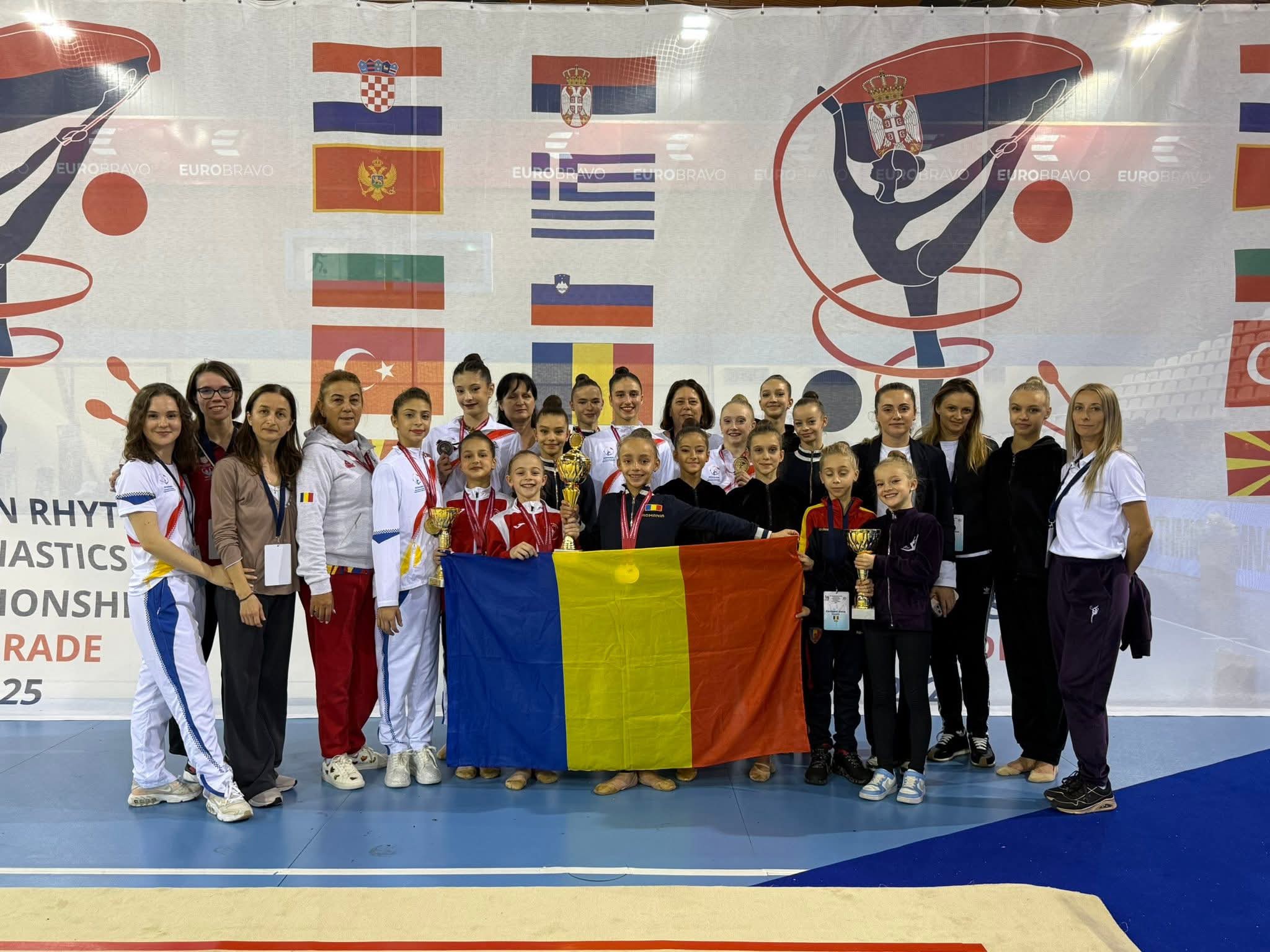 Excelentă performanță a gimnasticii ritmice arădene de la CS Municipal, care a pus umărul la obținerea de către România, pentru cel de-al treilea an consecutiv, la titlul de campioană pe națiuni la Campionatul Balcanic de la Belgrad (Serbia)! Performera clubului arădean, antrenoare Daniela Chiriac, Tatiana Novikova și Flavia Bercu, a fost mezina Elena Tătar (foto, centru), care la categoria copii (născute 2015 sau mai tinere), a obținut o medalie de argint la individual compus și două medalii de aur, la sol și coardă.