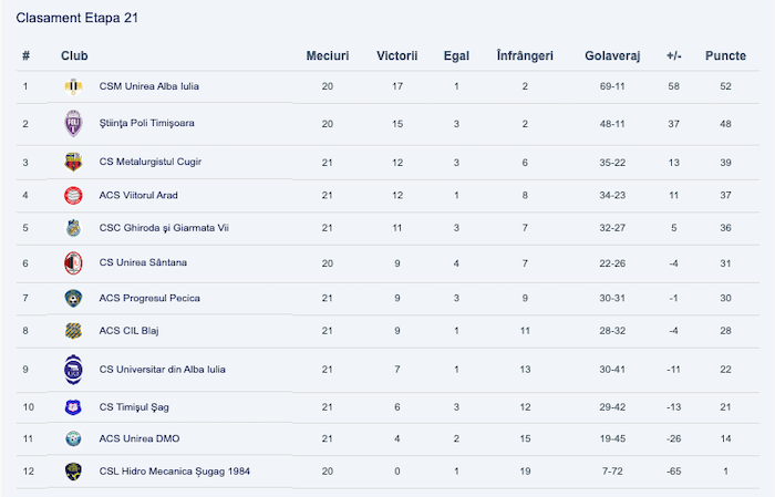 Ultima etapă: Viitorul – Blaj, Șag – Sântana, Șugag – Universitar Alba Iulia (0-3 f.j.), Unirea DMO – Poli, Unirea Alba Iulia – Ghiroda, Pecica – Cugir.